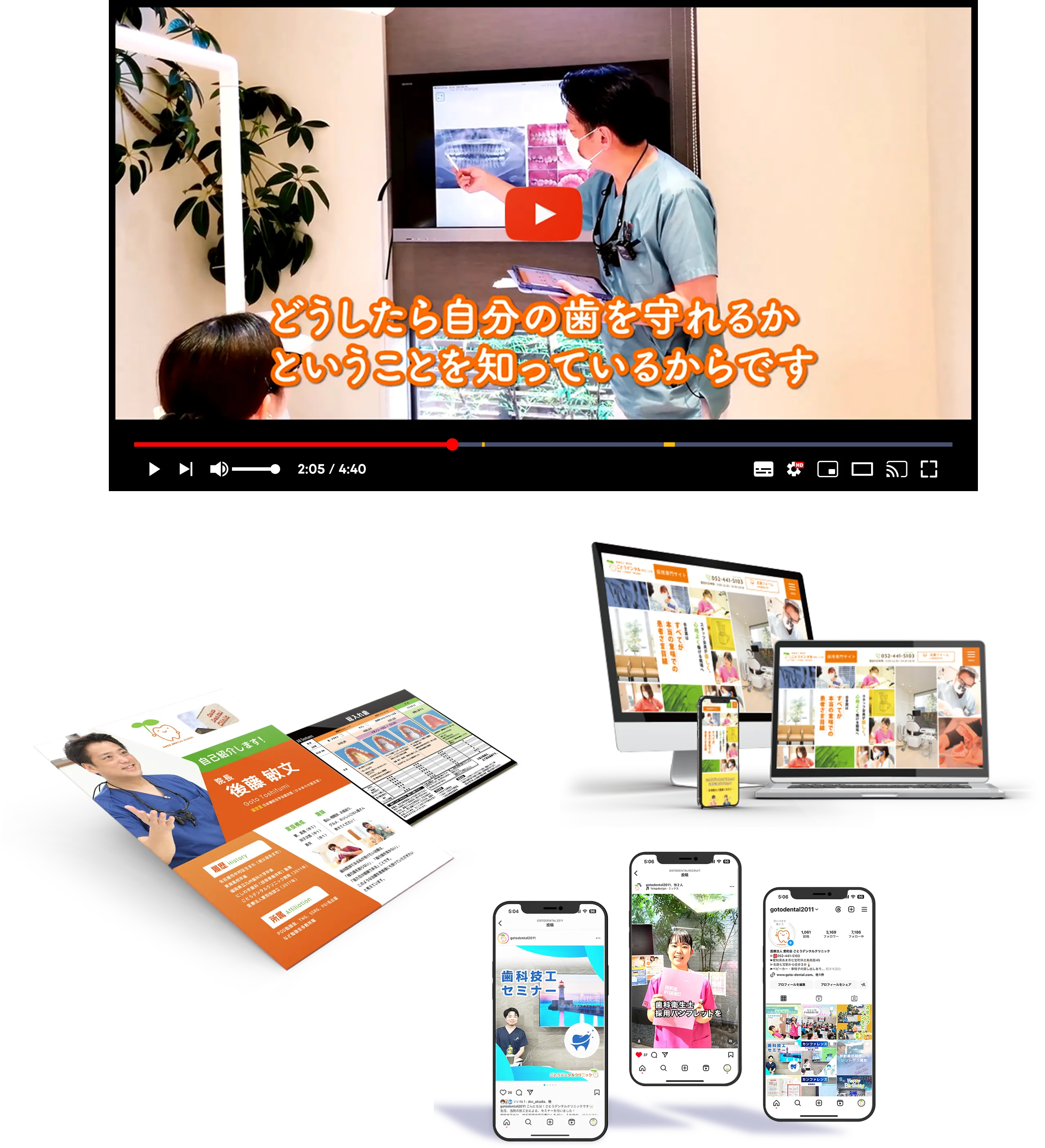 職場のリアルを伝える採用ブランディングを軸に、パンフレット・インタビュー動画・SNS・Webなど複数の媒体で、医院の魅力・価値観・人間関係を「見える化」しました。また、院長やスタッフの声を活かしたストーリー性あるコンテンツを制作し、求職者が共感しやすい情報設計を行いました。