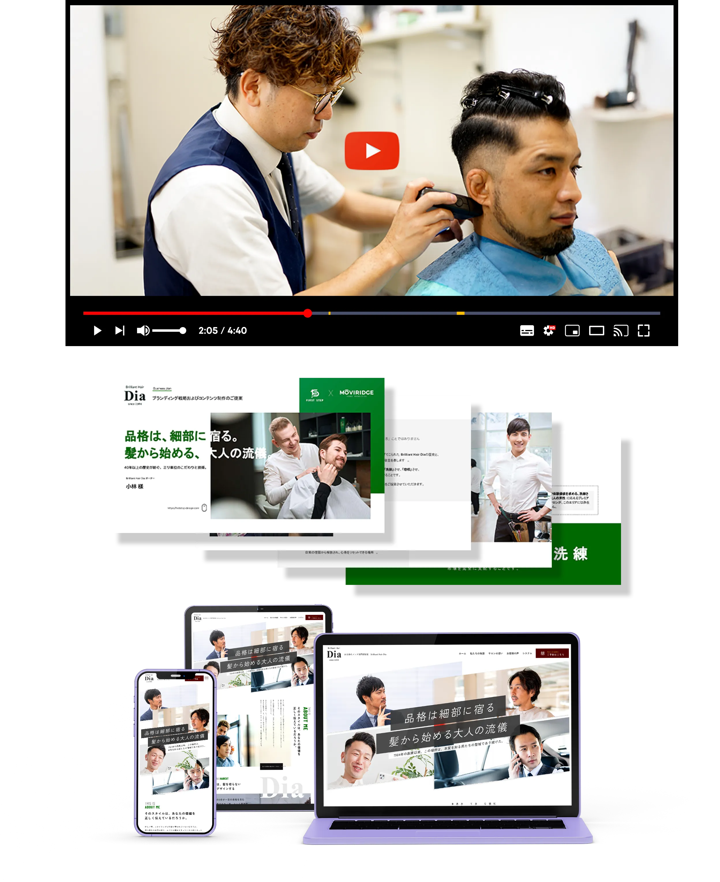40年の歩みと理念を核に、新規ホームページ・SNS設計・サロン案内動画・ブランドコンセプト・ビジュアルイメージをトータルで制作。ターゲット層である“モダンジェントルマン”に向けて、統一感あるデザインとメッセージで世界観を確立し、ブランド体験全体を再構築しました。